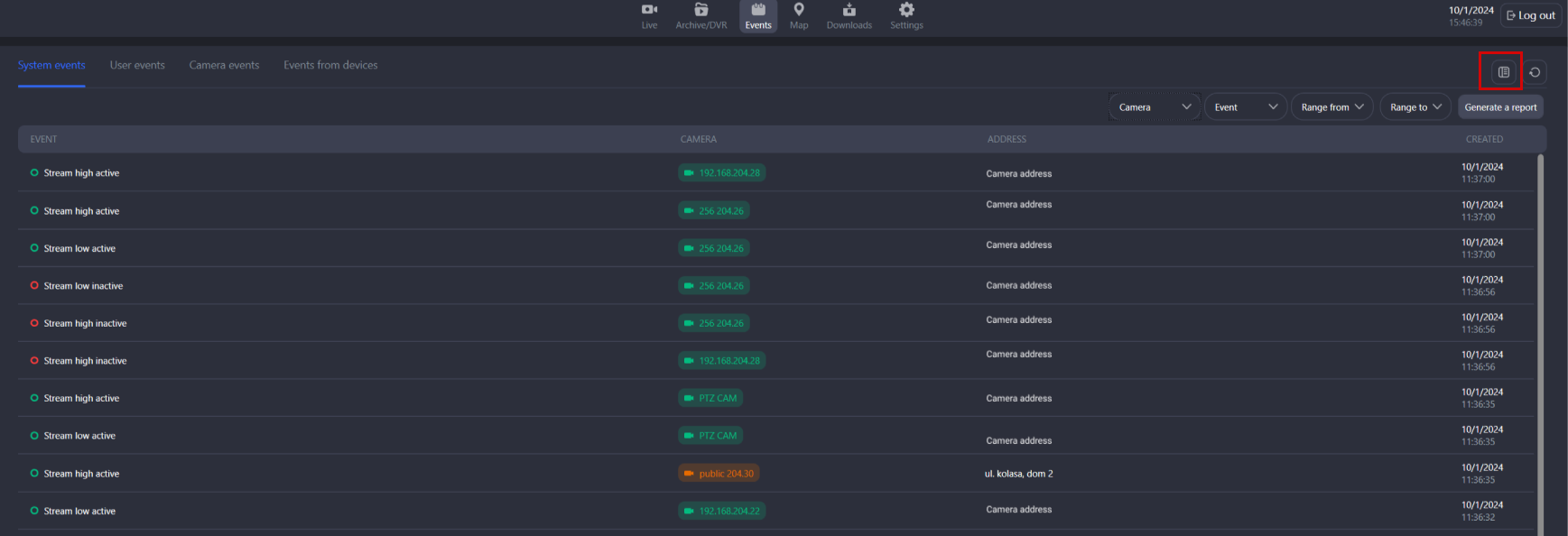 You can generate a report for each type of events and download it in the .XLXS file. The generated report inherits all the filters set on the tab when generating a report. If the filters aren’t set, the report will contain all the events of the selected type.