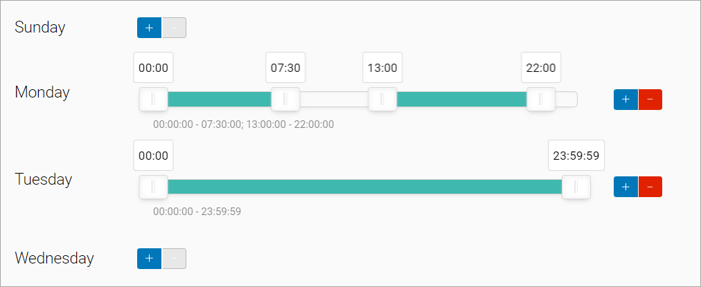 Set a schedule for SMTP motion detection on each day, if required. You have the flexibility to set multiple time periods within a single day. In case a schedule is not set for a particular day, the system will default to detecting SMTP motion continuously throughout that day.