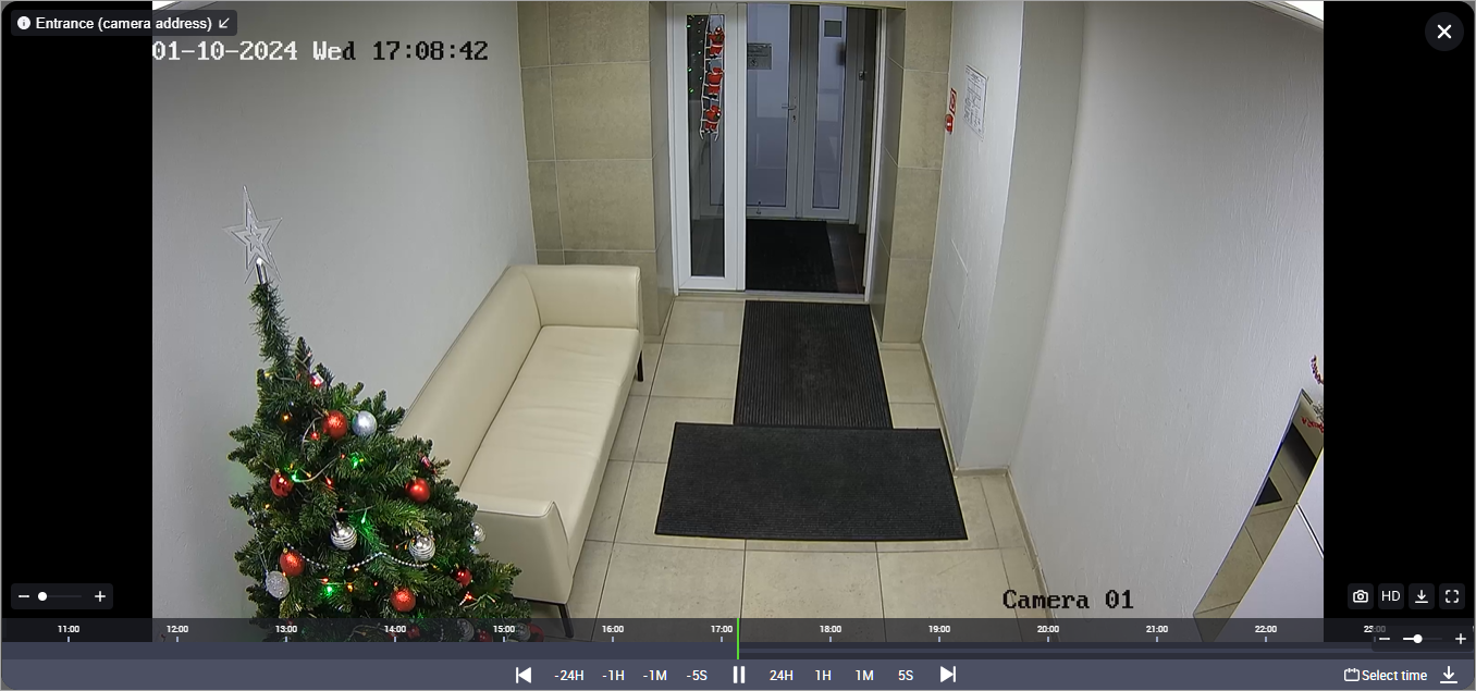 When you click on the camera name, the entire screen is occupied by a video player window for viewing the live feed. Archive viewing is also provided.