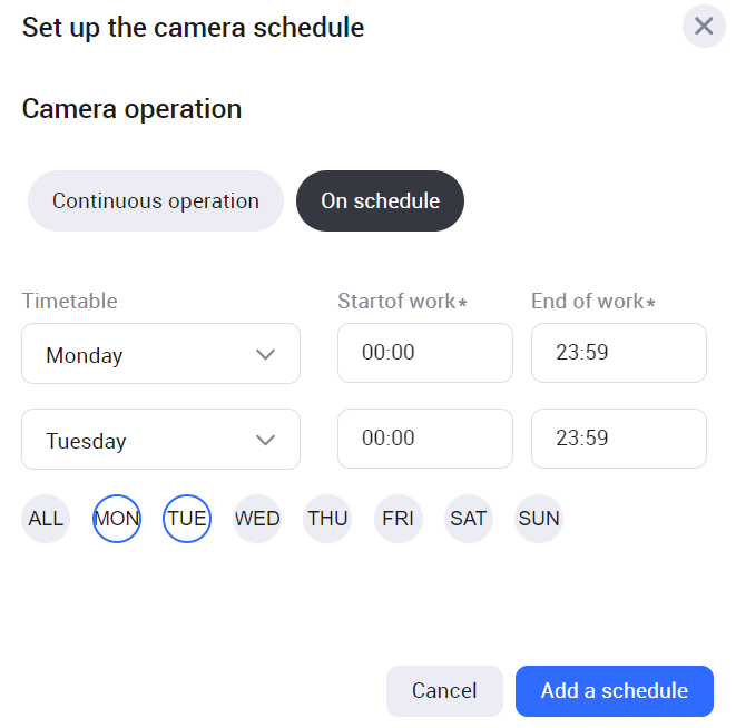 By default, the camera continuously records the archive (unless the administrator has set a different schedule). In this case, it is possible to configure an archive recording schedule.