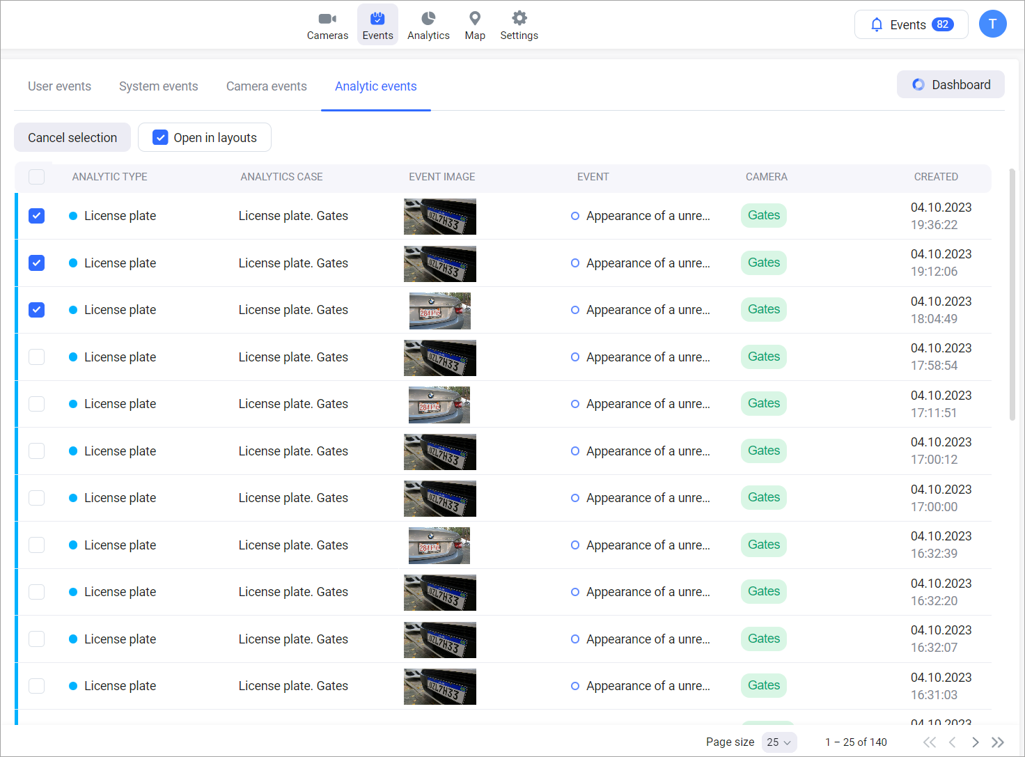 To do this, select multiple rows in the list of system events and click Open on layout.