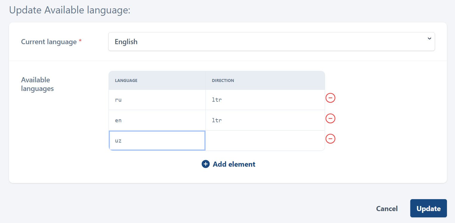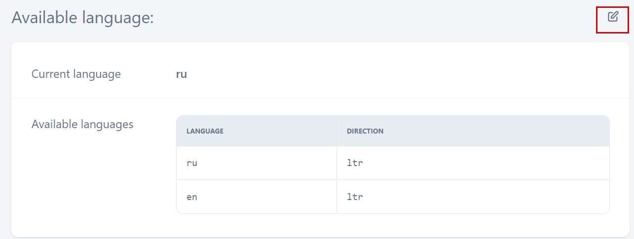 Navigating to this section opens the page with the current language settings. To edit the settings, select the Edit icon.