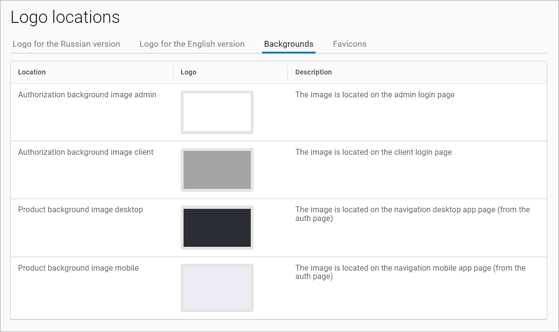 The Backgrounds tab is intended for uploading background images that are displayed in the Administrator client and user web interfaces on the login page.