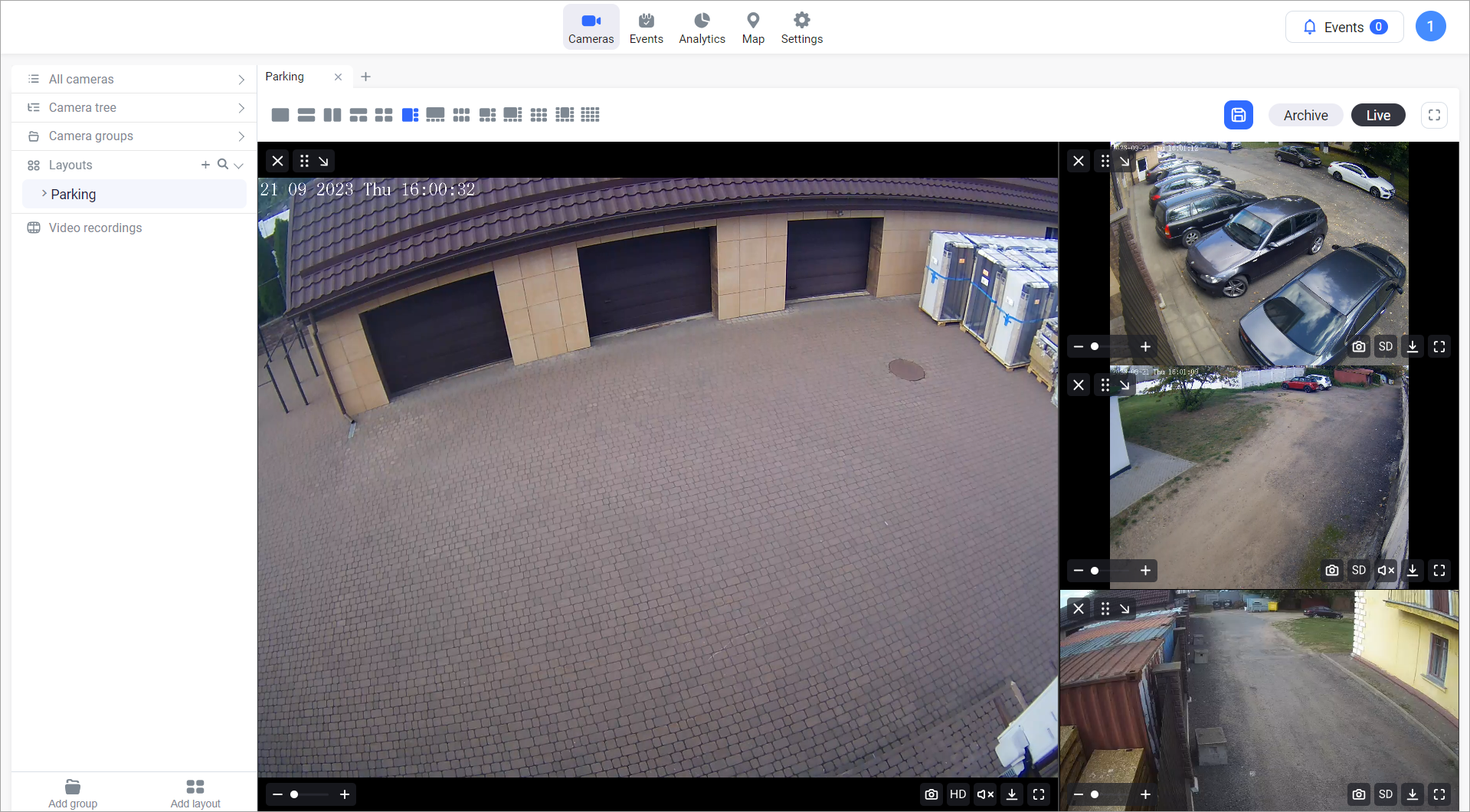 The working area of the current section is used to display bookmarks and cameras located on bookmarks according to specific schemes. The configuration of layouts, selection of schemes, and cameras are described in the Layouts section.