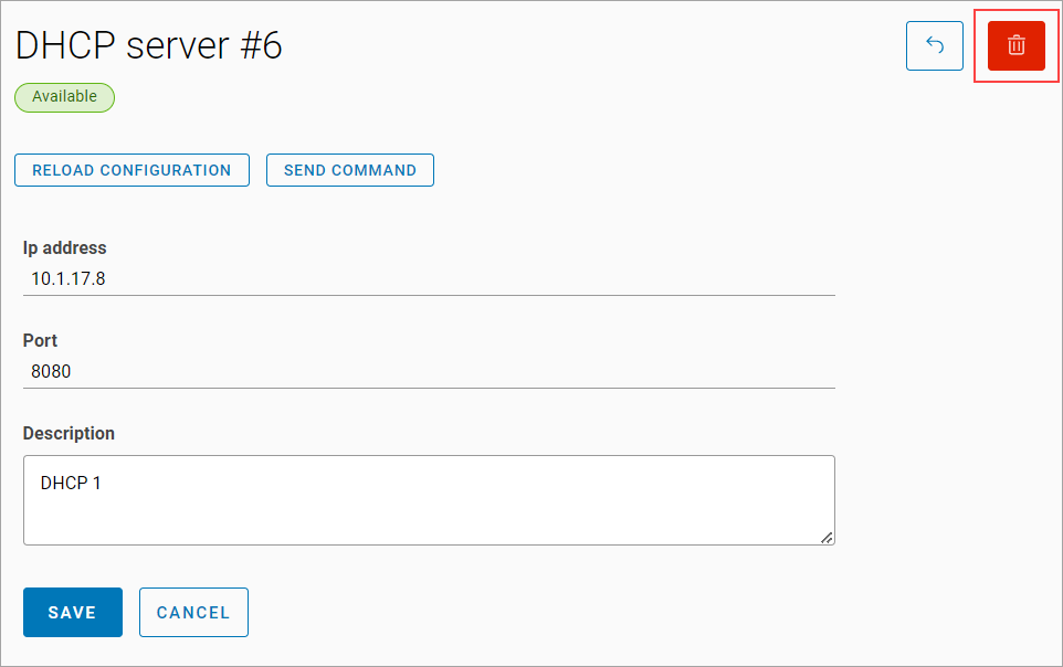 In the DHCP server view and edit window, click on the delete button
