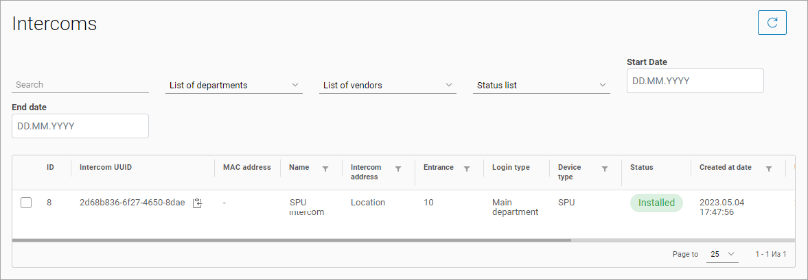 The table also provides a search function for intercoms: