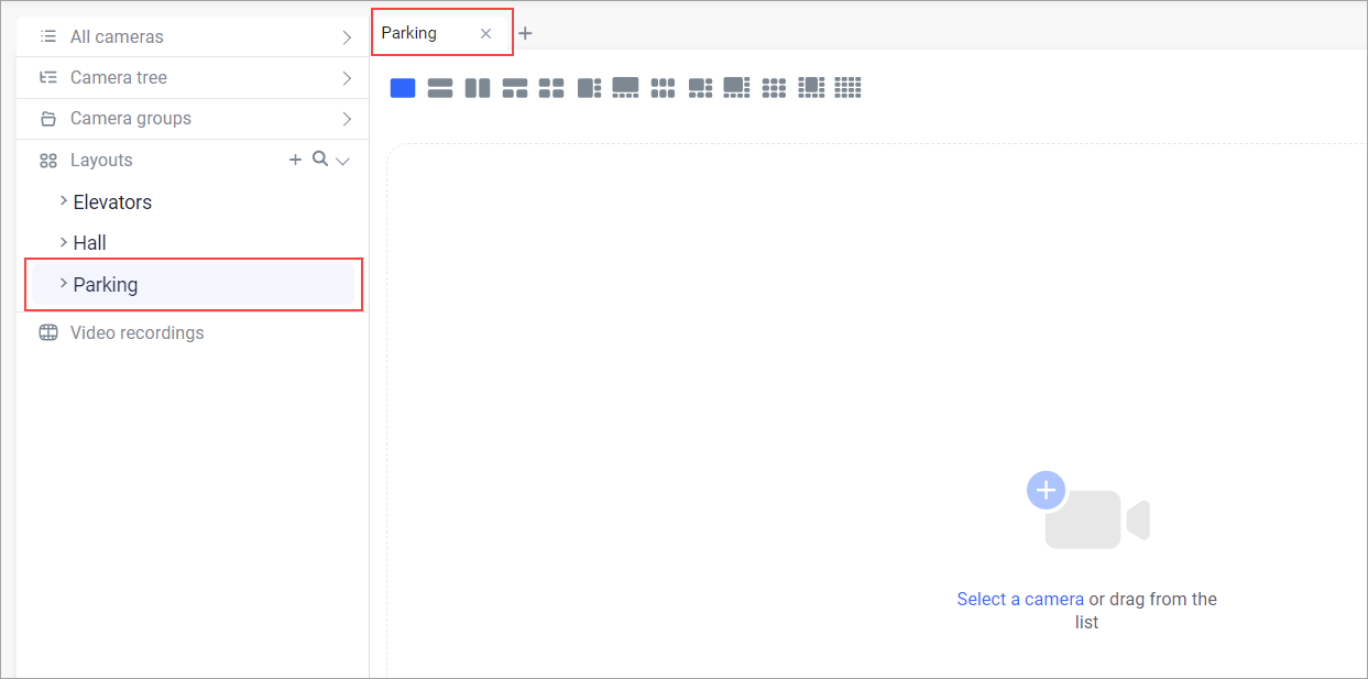 The Layouts tab is designed for creating custom camera layouts and selecting layouts for viewing cameras.