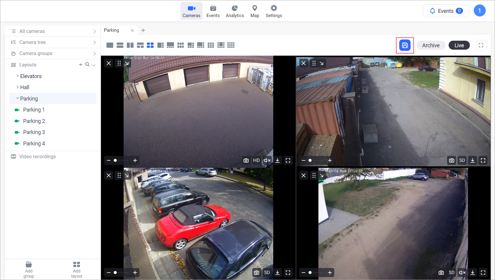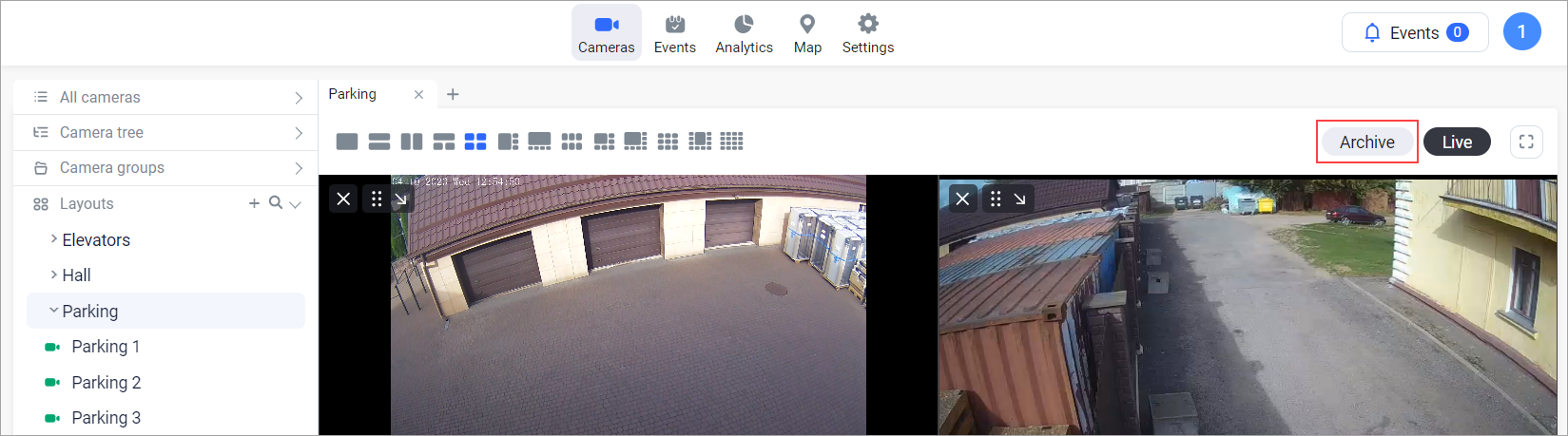 Each layout can contain from 1 to 16 cameras and allows simultaneous viewing of selected cameras.