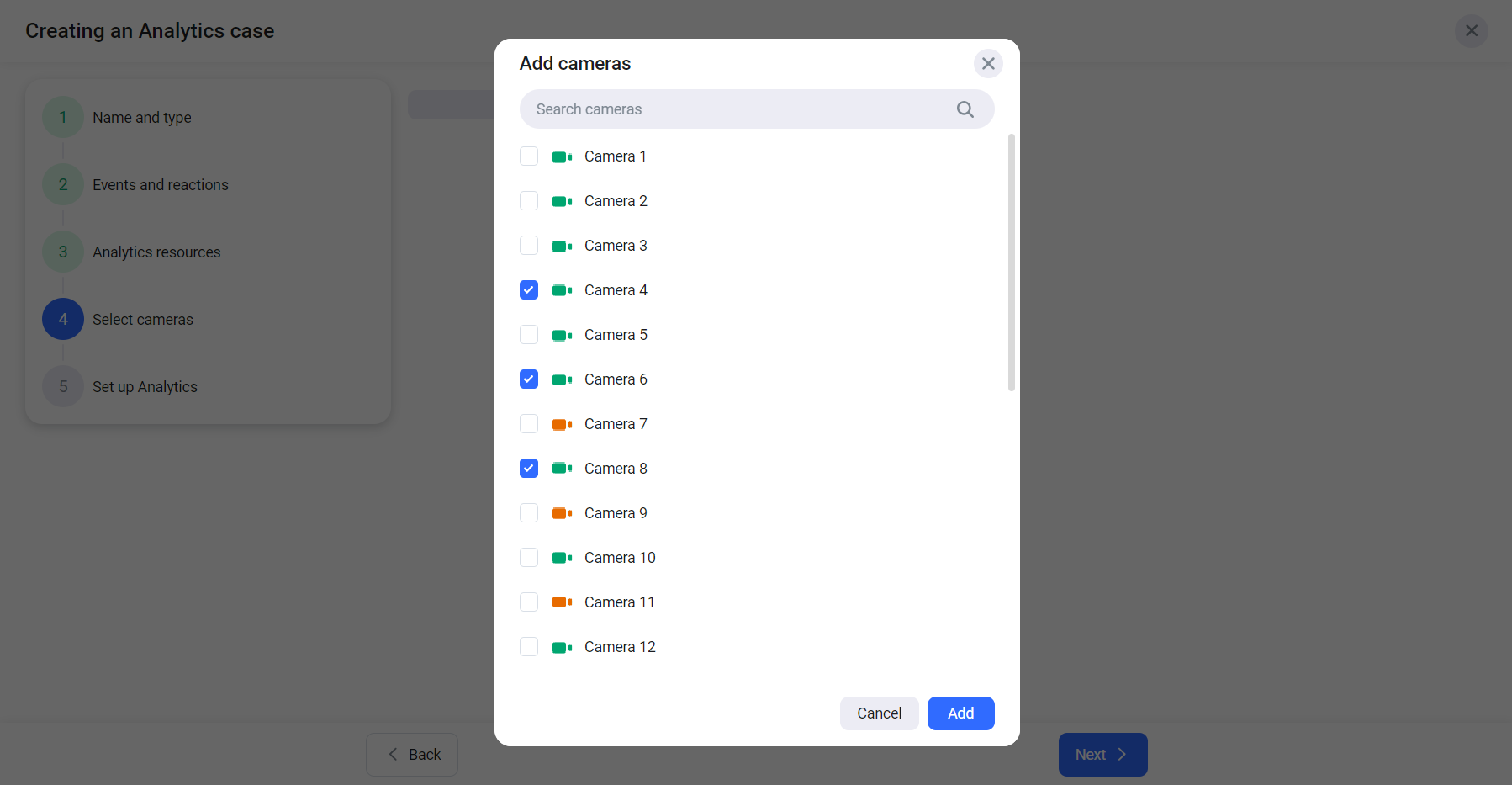 Select Add cameras and, from the opened drop-down list, select the checkboxes of the relevant cameras.