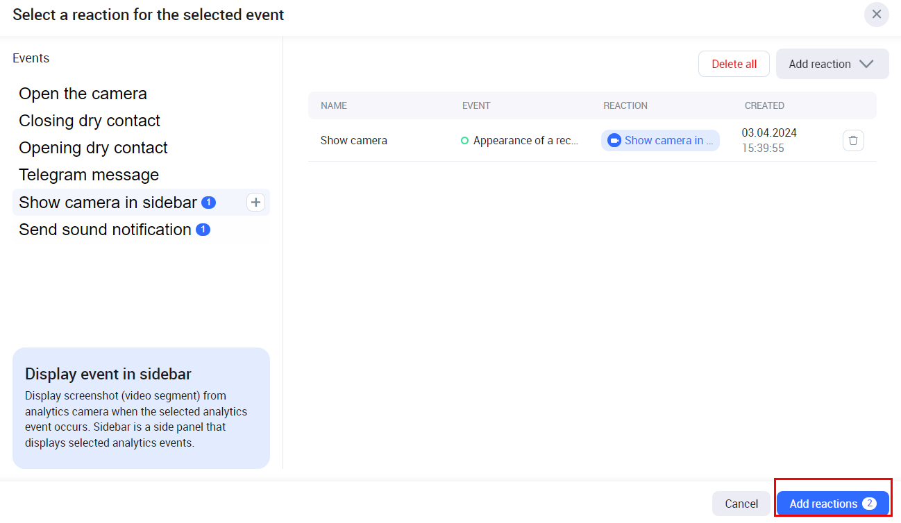 As a result, the added reaction is displayed in the list of reactions of the selected reaction type. To further use this reaction, when setting up cameras, select Add reactions.