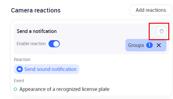 Delete a reaction for the current camera. For this, select the Delete icon of a relevant reaction.