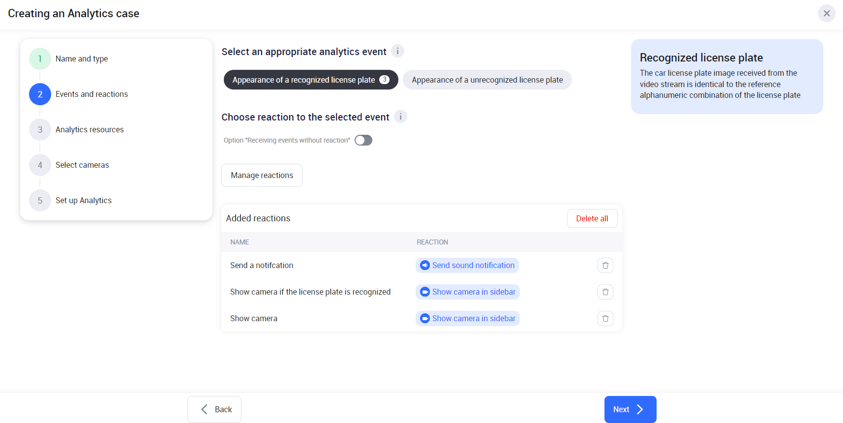 Under Camera reactions, all the added reaction on step 2 to the current analytics case will be enabled by default. Edit the settings if required:
