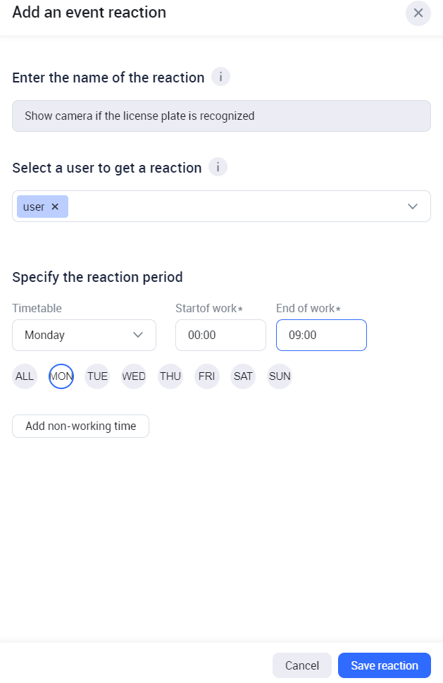Schedule the reaction period (mandatory). If you select the specific days, the default time is from 00:00 till 23:59. The time can be edited.