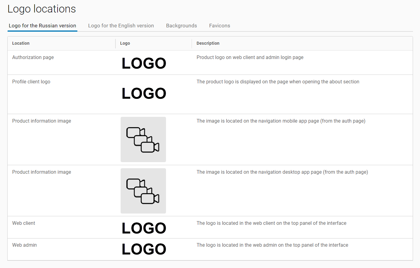 In the Logo for Russian version and Logo for English version tabs, you can upload images that are displayed in the Administrator client and user web interfaces when selecting the Russian and English languages, respectively.