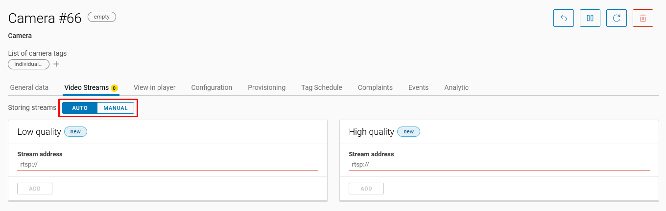 If the option to add video stream links is unavailable on the Video Streams tab and there is no Add button, switch the stream setup type from Auto to Manual.