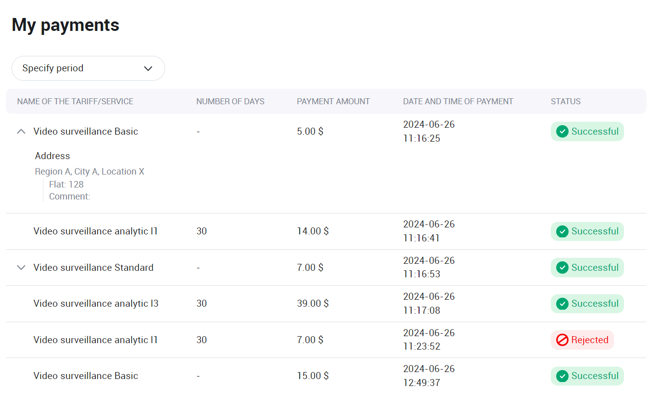 The My payments section displays information on all the payments (successful and rejected) related to the activation of the tariff plans and additional packages.