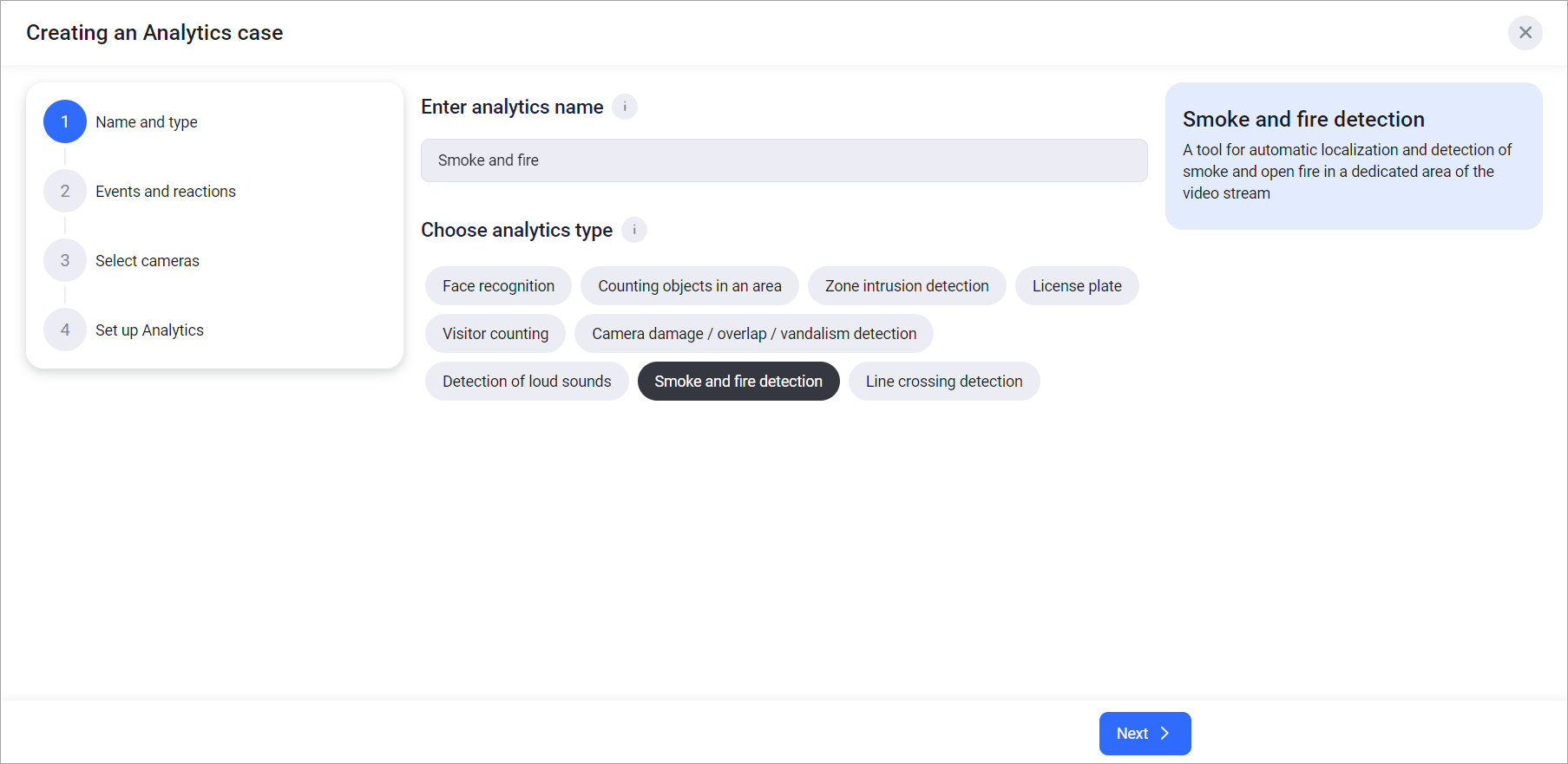The Smoke and fire detection analytics type is designed to detect smoke and fire in a designated area that was configured during the process of adding this analytics type.