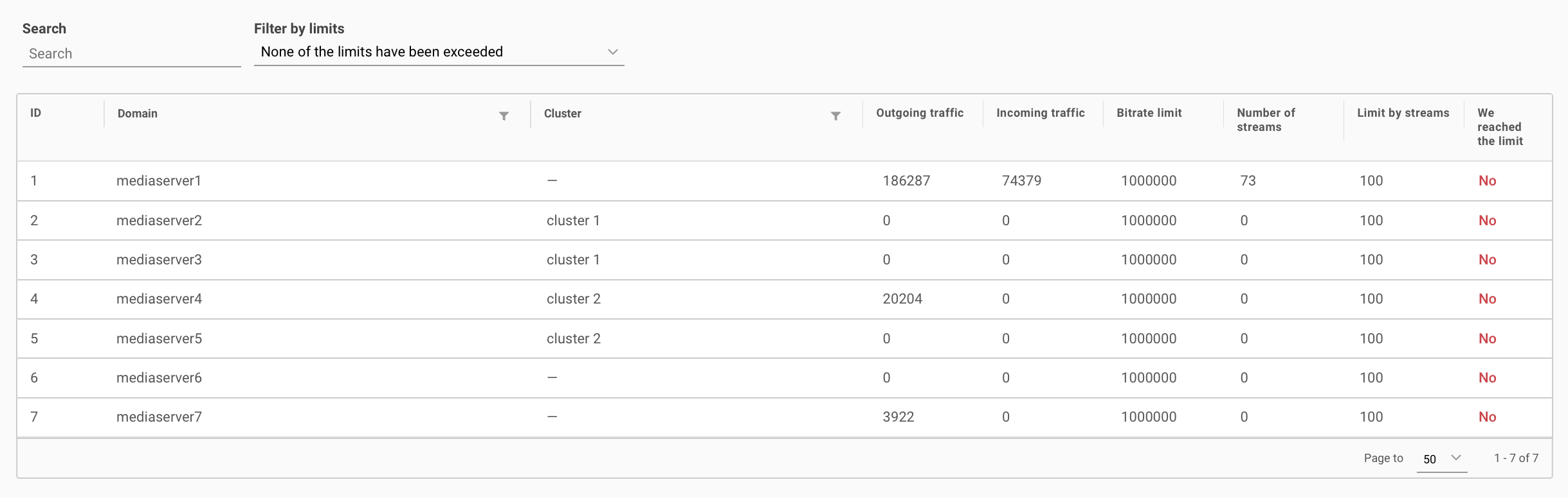 The Statistics subsection contains information about server domains, clusters, incoming/outgoing traffic, bitrate limits, stream counts, stream limits, and limit achievements.