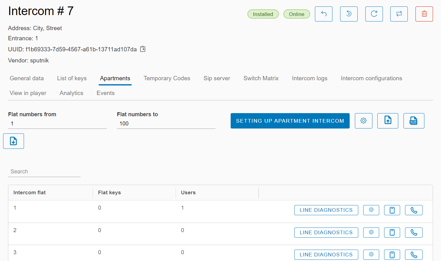 The intercom operational status with one of the values: Installed, Initializing, Not installed.