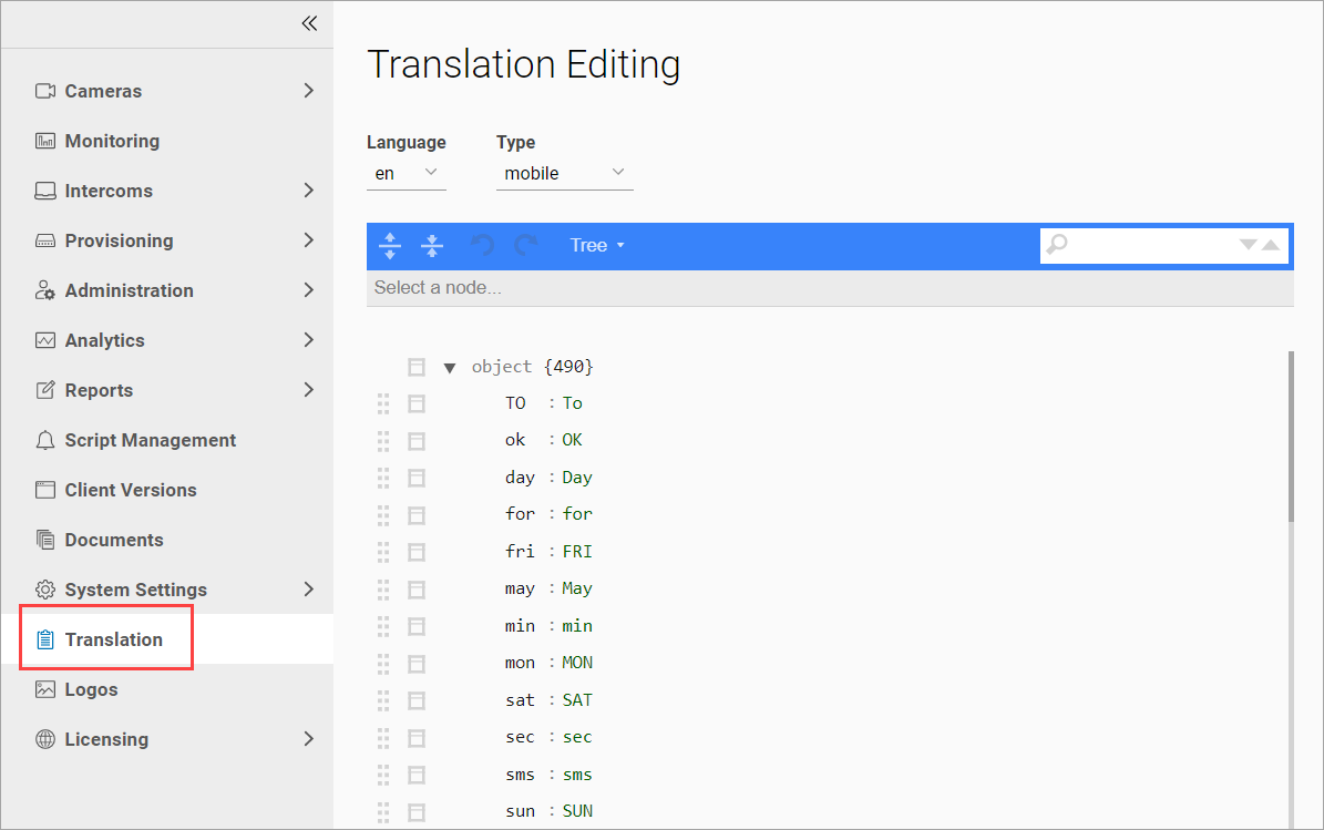 The Translation section allows you to customize the text labels for various system objects.