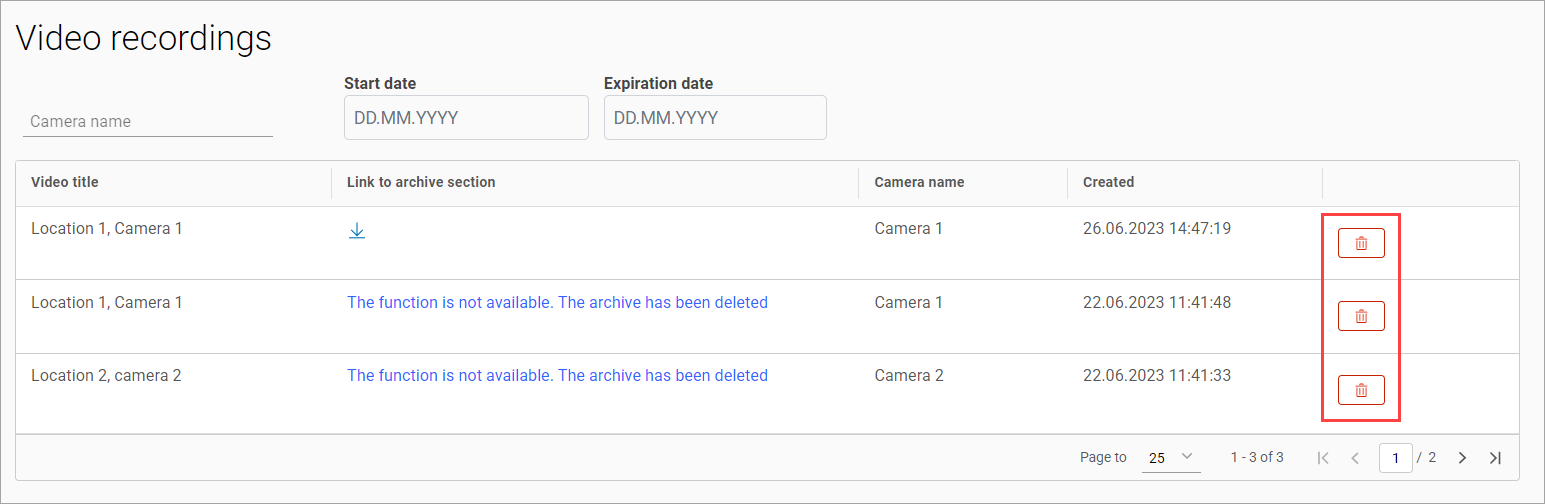 The Archive video > Video recordings section is designed to display all sections of the archive downloaded by the user.
