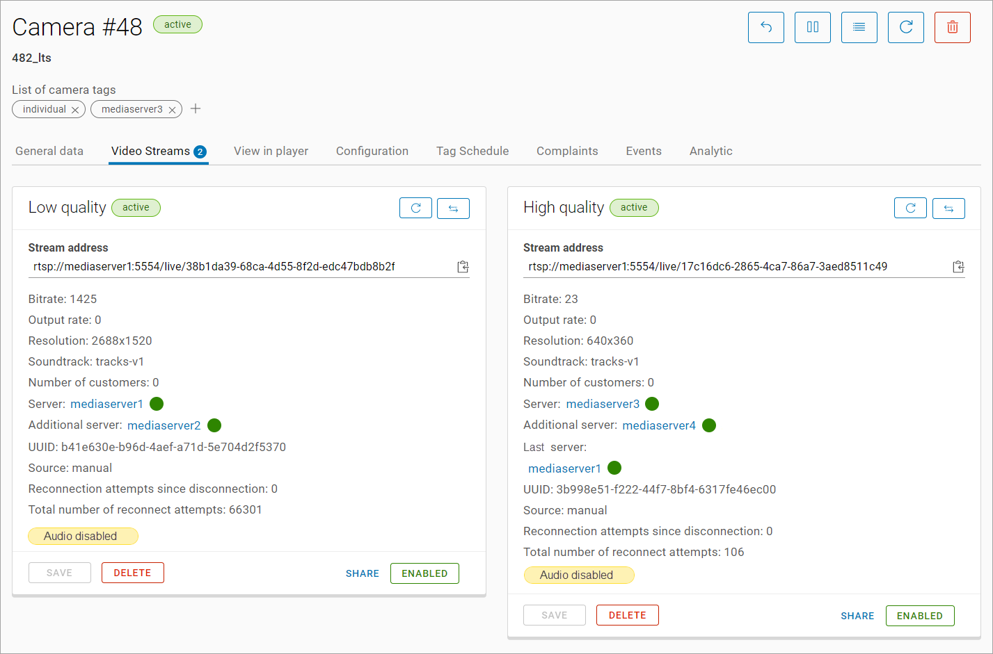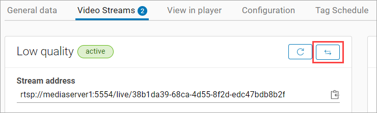 Additional server. Refers to the additional media server reserved for the stream backup in case the main media server fails. Selecting the name of the server, will navigate you to the card with the details of the media server.
