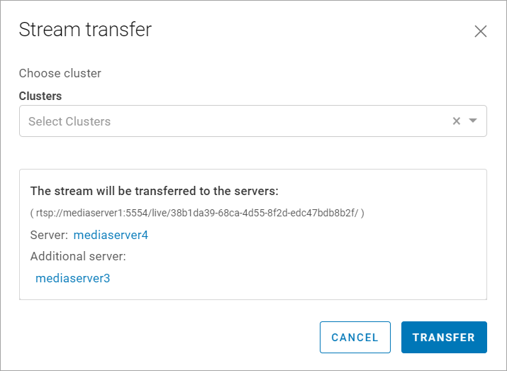 If the stream is not reserved, the system performs a search for the main media server among the non-clustered media servers. When the search is completed, you can select a cluster with two media servers to reserve the stream on an additional media server.