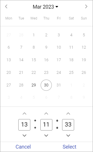 You can also select a specific date and time to view the recording. Select the Calendar button, set the date and time, and Select. You can select only the dates where archive is available. The other dates are grayed out.