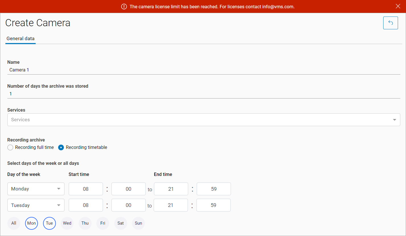 If there is no available license, a corresponding message will be displayed on the screen when you try to create a camera.