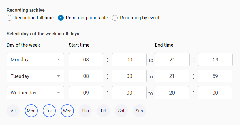 Recording timetable. Recording is performed according to the set schedule.