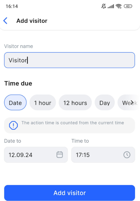 On the Visitors tab, the mobile app user can easily manage access to premises. Here, they can add up to 5 (five) visitors and generate a temporary intercom codes for them. This code can be shared with the visitor so they open the door by themselves.