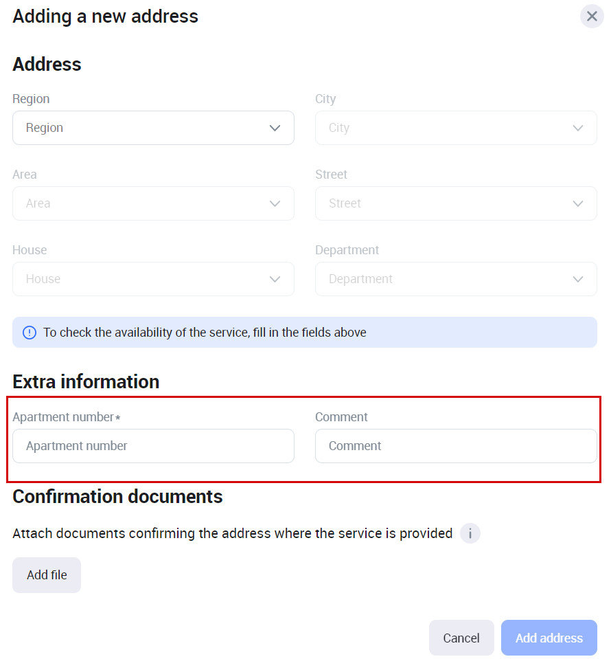 An example of the added extra fields in the Extra information section when the user completes the form on step 1 (Service address).