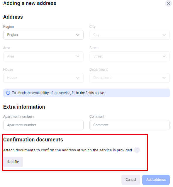 An example of the field to upload files in the Confirmation documents section when the user completes the form on step 1 (Service address).
