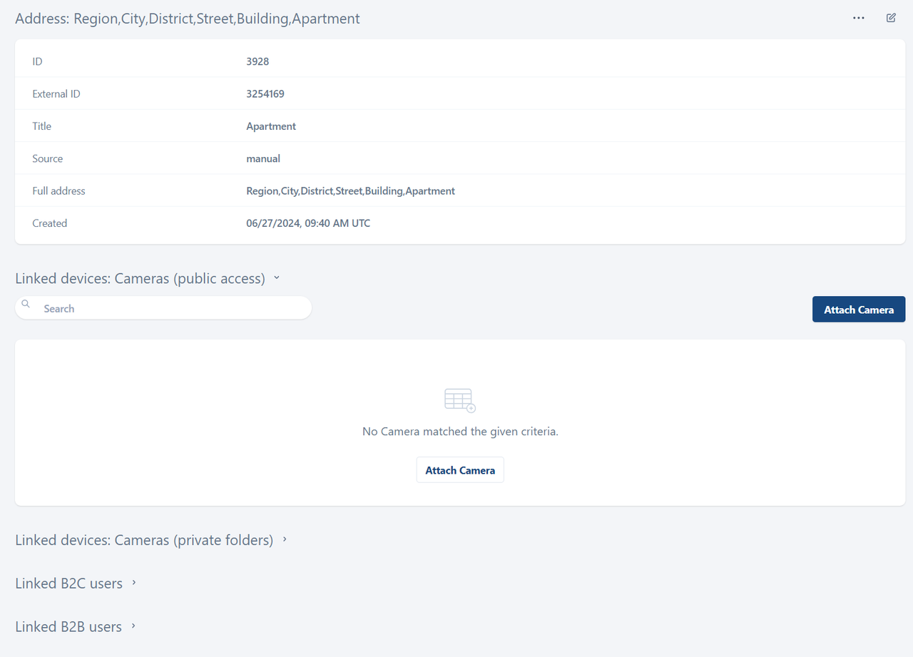 In the Linked devices: Cameras (public access) section, you can find the list of publicly accessible cameras linked to the current address.