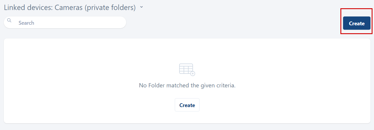 To create a private folder, navigate to the card of the last address element. Under Linked devices: Cameras (private folders), select the Create button.
