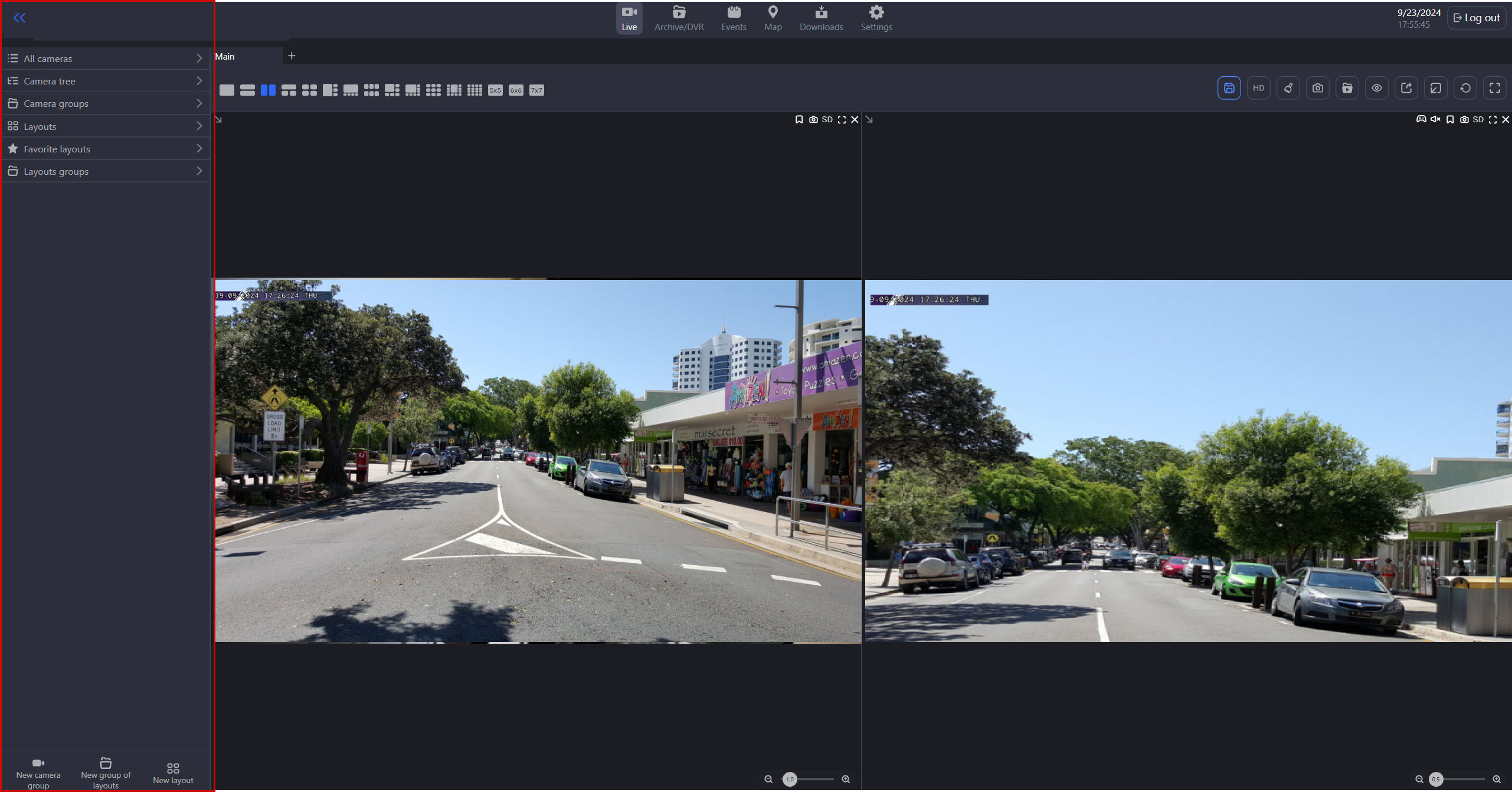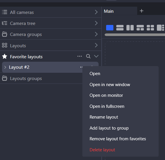 This system offers several additional features, including renaming groups, adding cameras to groups, and viewing layouts in a separate window, and more. These functions can be accessed through a context menu of a selected item.