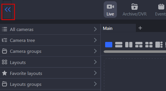 The left-side panel of the Desktop interface lists all available to the user cameras. The panel is available on the Live and Archive/DVR tabs.