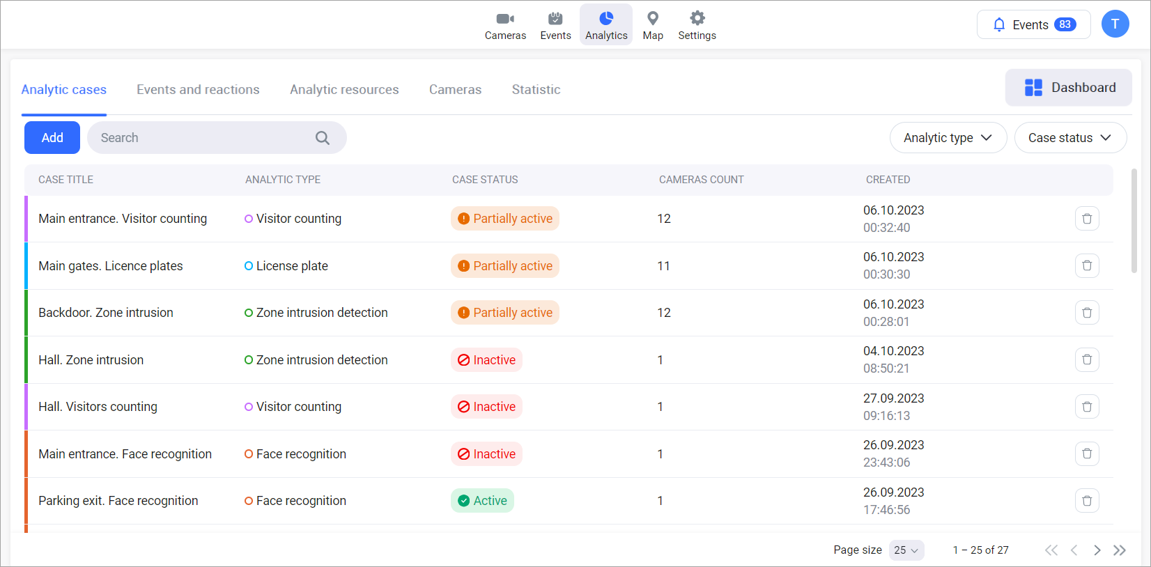 On the page, you can find a list of existing analytics cases. For each case, the following information is provided: