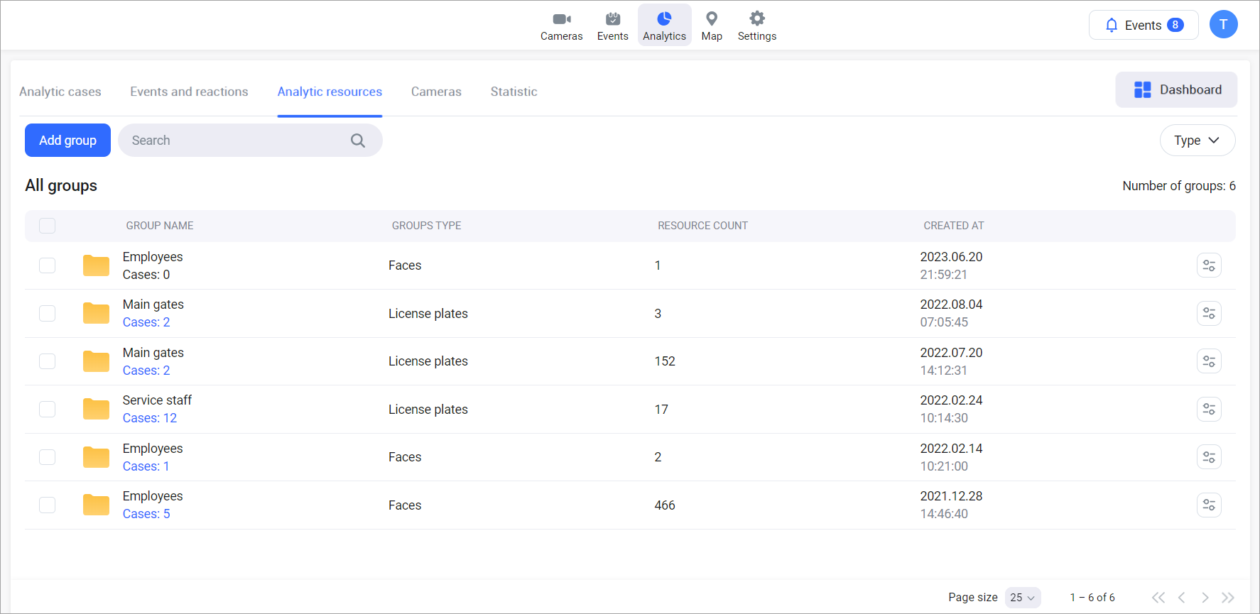 Under the group name, the number of analytics cases in which this group is currently used is indicated. When you select Cases, a list of cases is displayed.