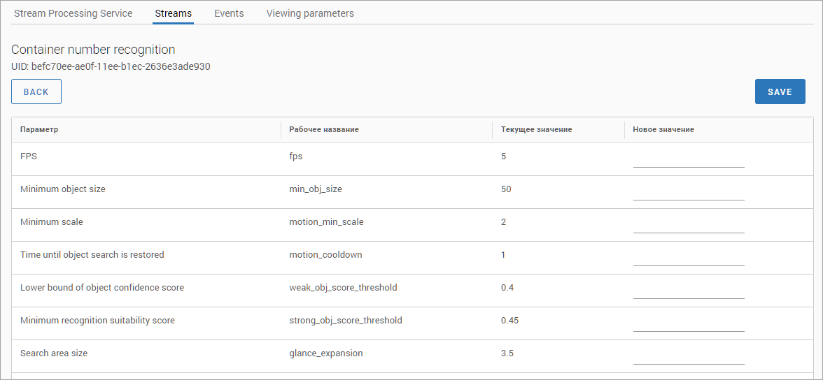 If necessary, enter new values in a relevant column and Save. As a result, the new values will be applied only for this video stream in a specific analytics case.