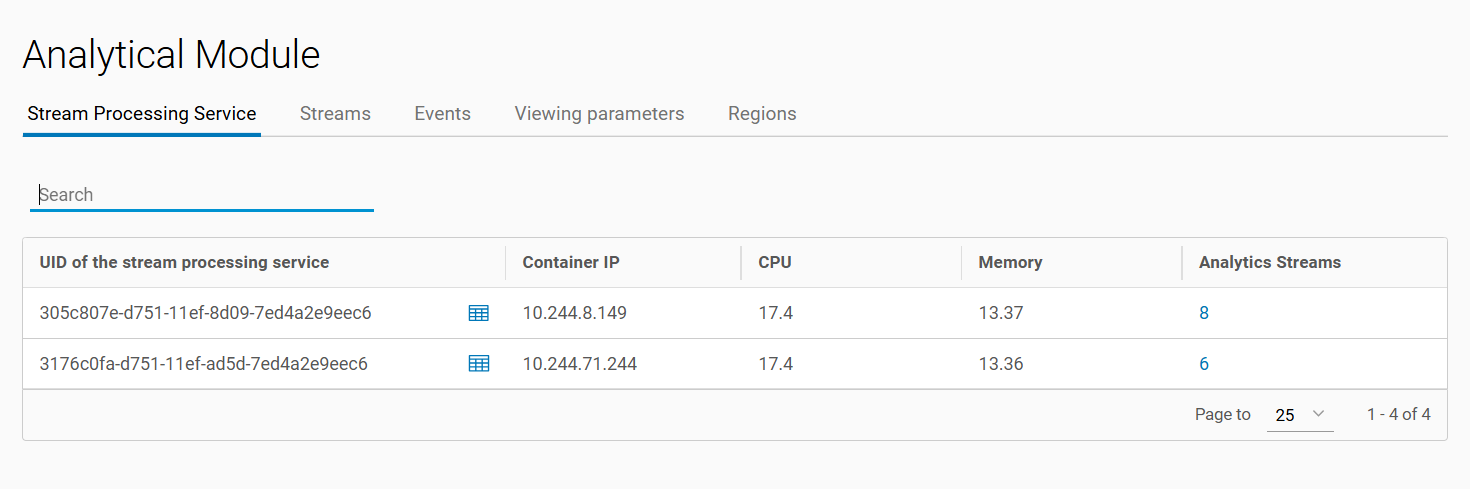 Analytics streams – displays the number of analytics video streams per stream processing service. Selecting a value will navigate you to the Streams tab that features filtering by analytics cases processed by this service.