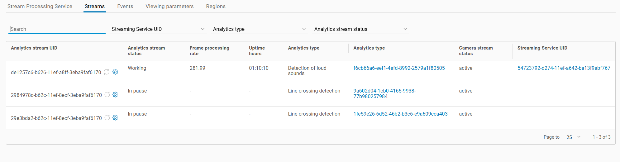 Streaming service UID. Displays a UID of the camera video stream. Selecting the value navigates you to the Stream processing service tab to this stream selected.