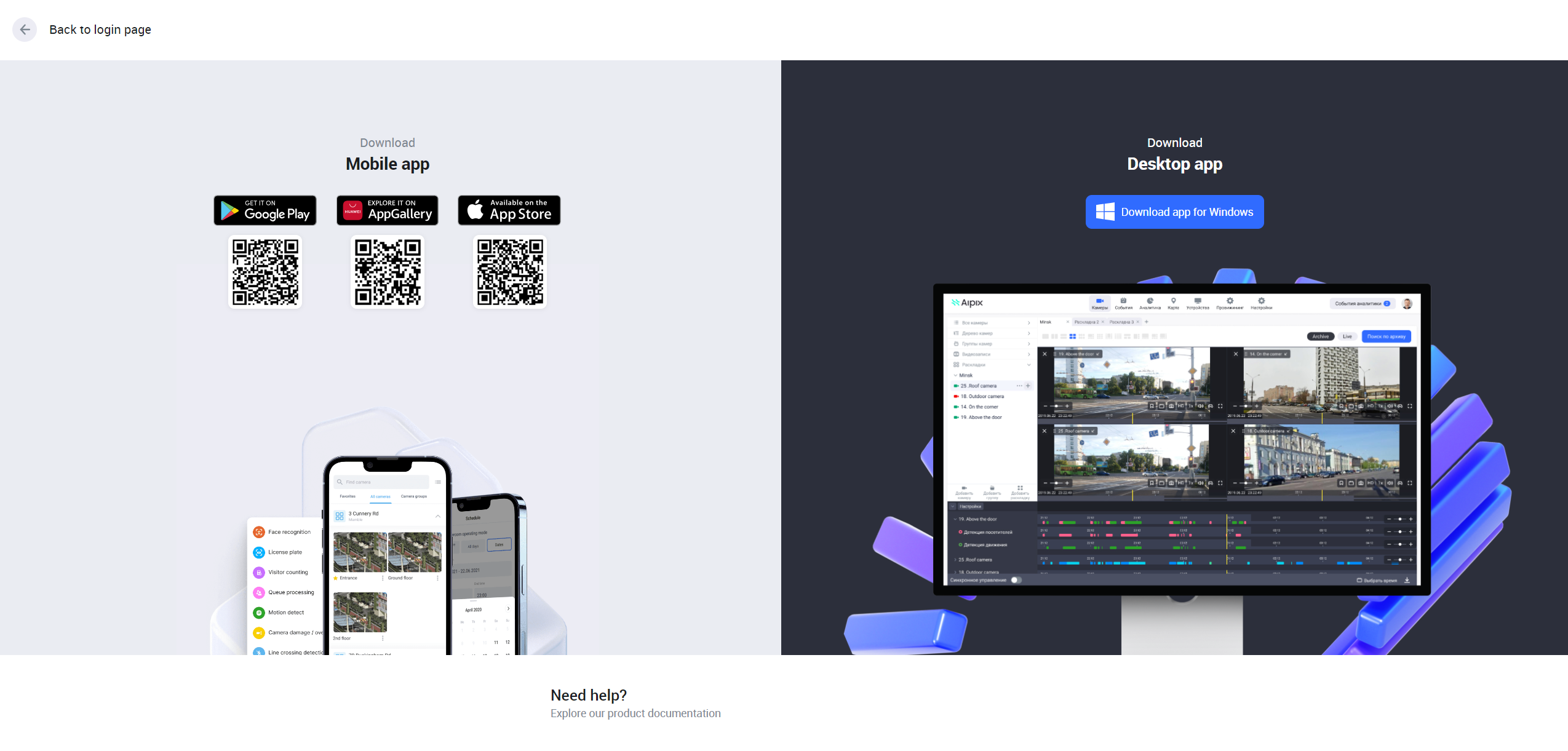 Use the login page of the web interface. On the authorization page of the web interface, select the Download the app and view product documentation button. This opens the page, where you can scan a relevant QR code or navigate to a relevant app store.