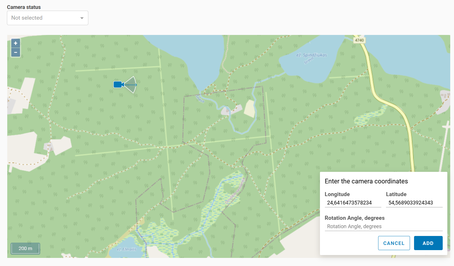 Drag a camera to the map. As a result, a form to complete camera coordinates will open at the bottom right.