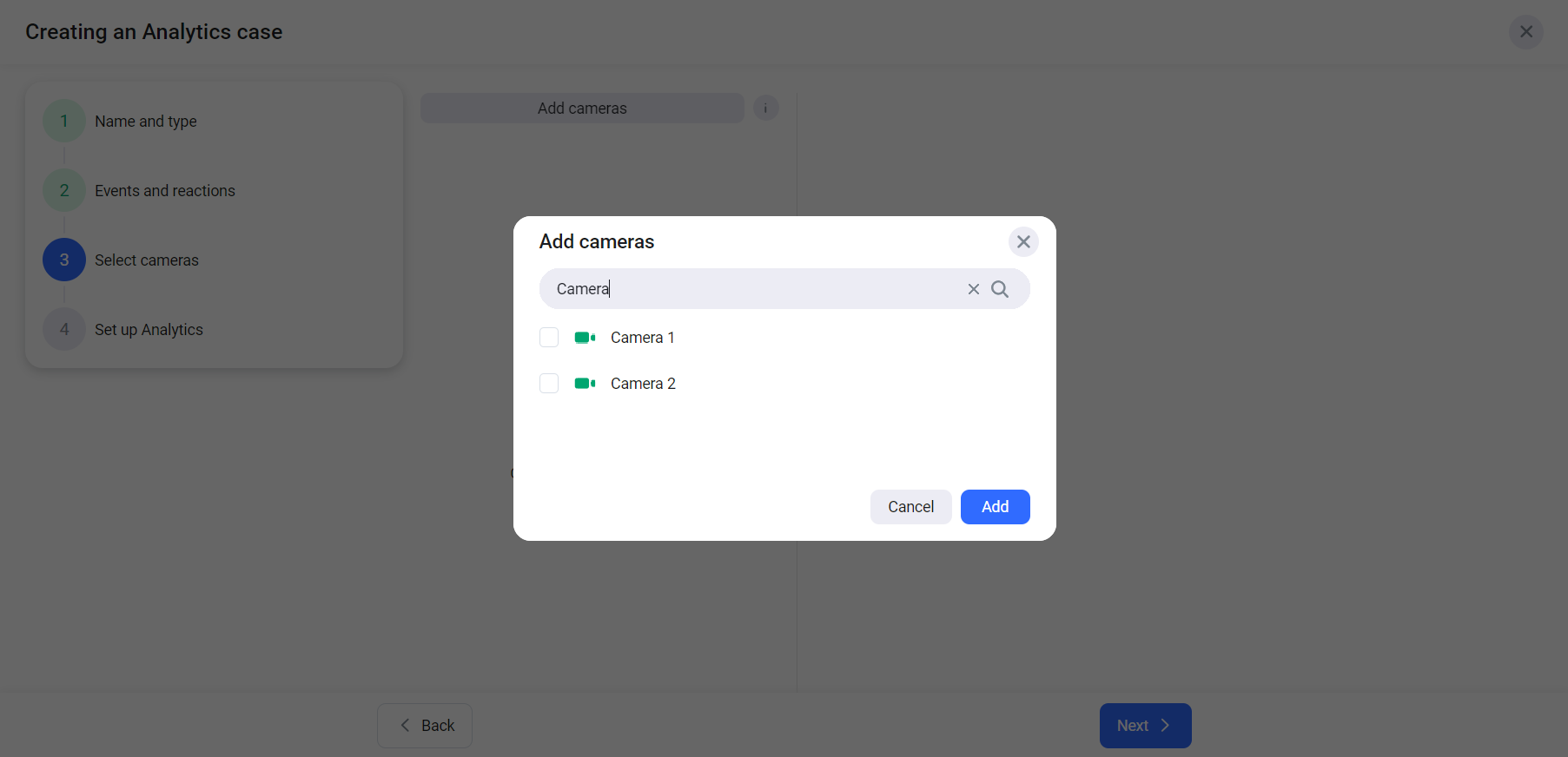 Select Add cameras and, from the opened drop-down list, select the checkboxes of the relevant cameras.