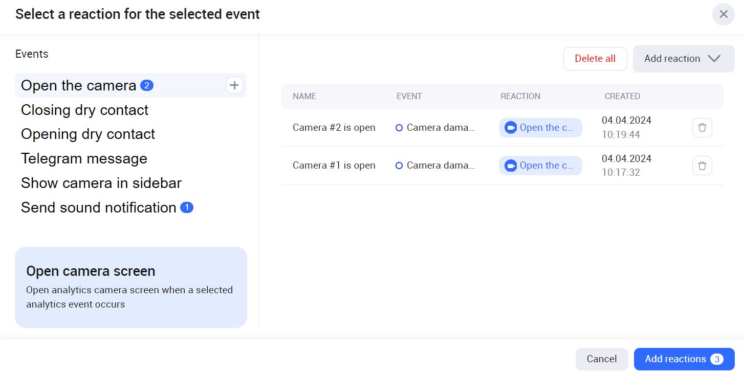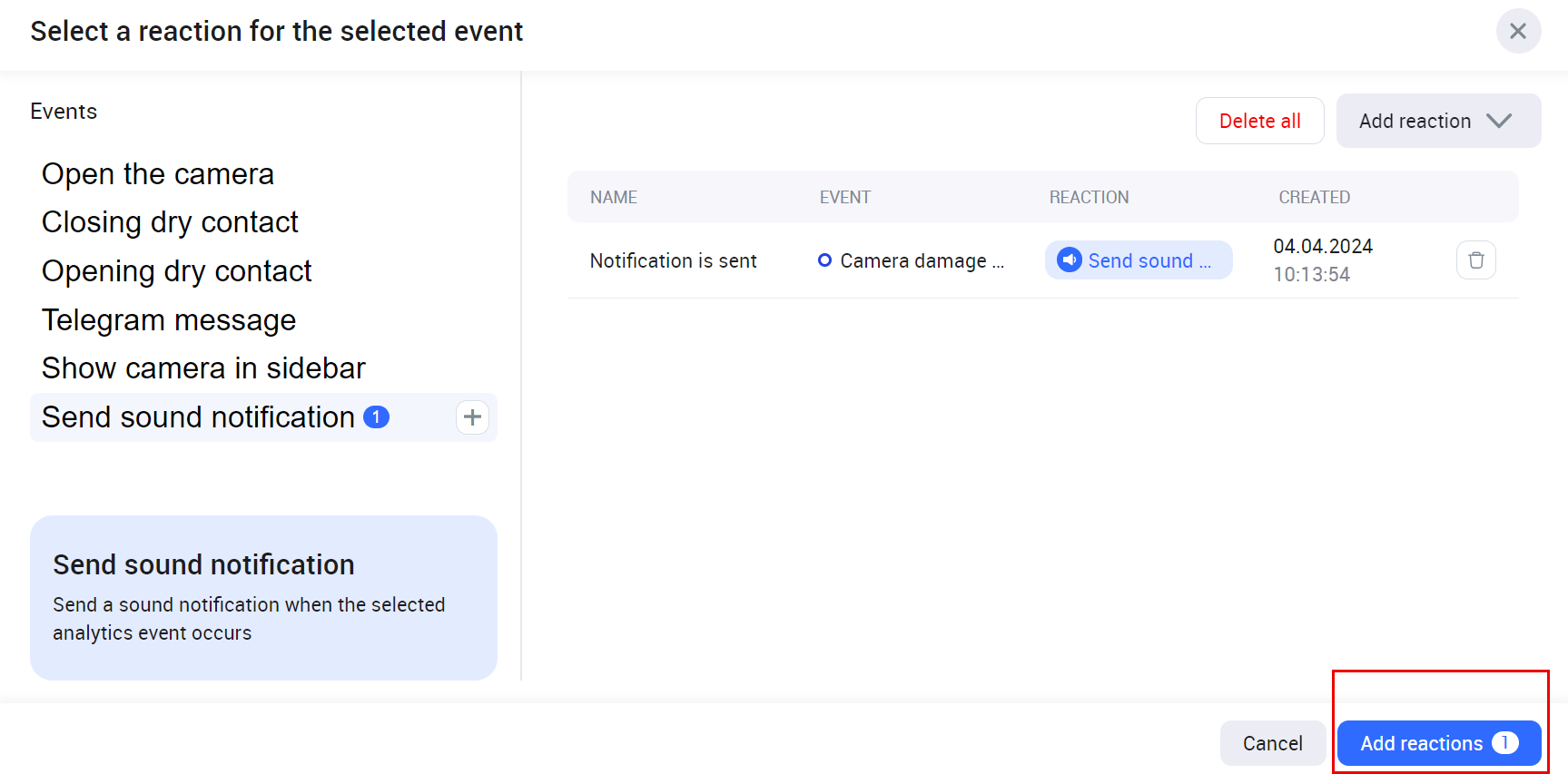 As a result, the added reaction is displayed in the list of reactions of the selected reaction type. To further use this reaction when setting up cameras, select Add reactions.