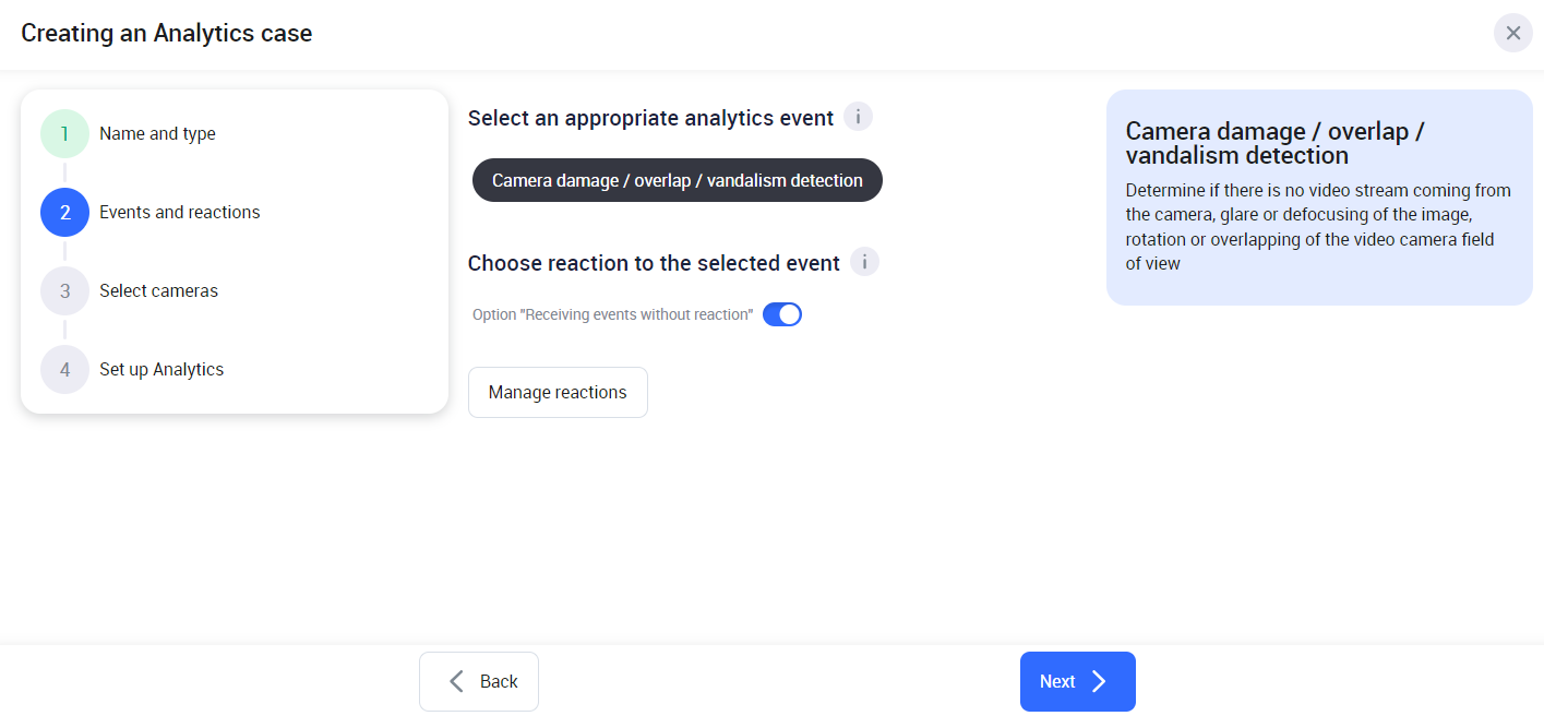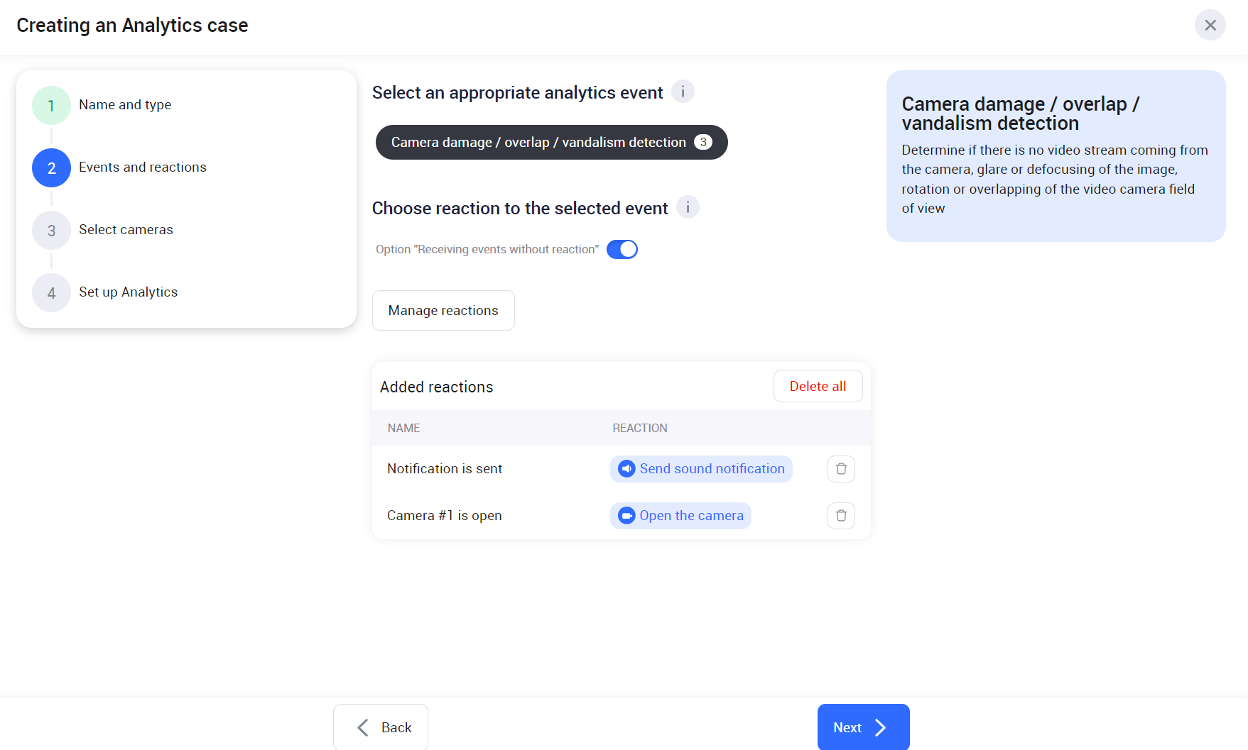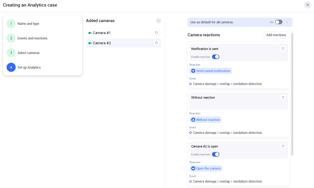 Under Camera reactions, all the added reaction on step 2 to the current analytics case will be enabled by default. Edit the settings if required:
