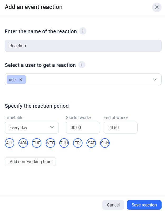 Schedule the reaction period (mandatory). If you select the specific days, the default time is from 00:00 till 23:59. The time can be edited.