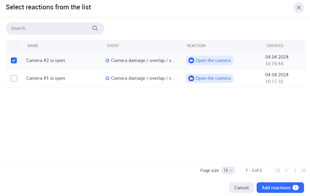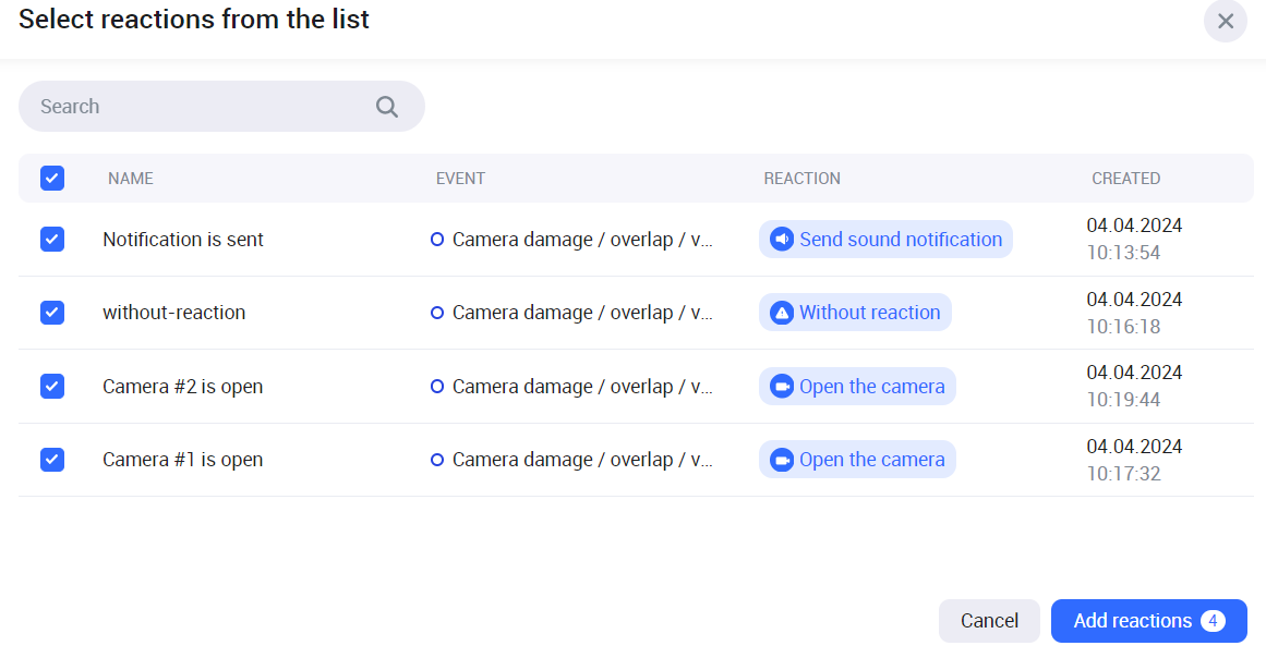 As a result, the added reaction is displayed in the list of reactions of the selected reaction type. To further use this reaction, when setting up cameras, select Add reactions.