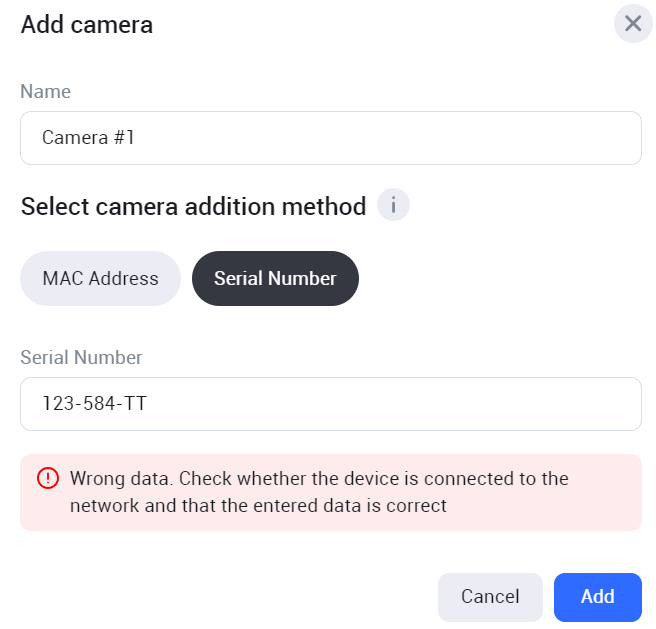 A MAC address and a serial number can be found on the camera device. A MAC address is represented as a 12-digit sequence of numbers and Latin letters from A to F.